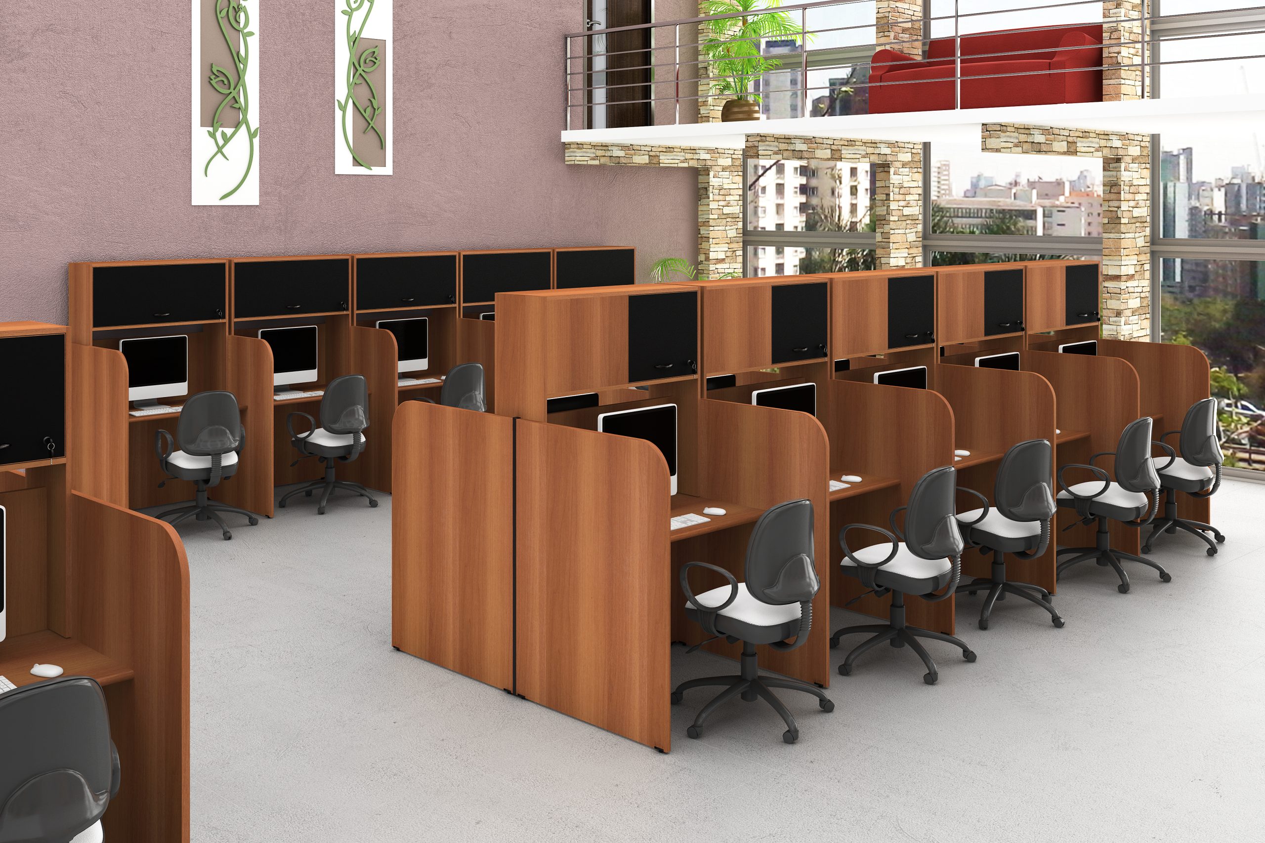 Baias para telemarketing montadas frente e verso opcional com armários suspenso, confeccionado em MDP, Laterais em MDP 18 ou 25 mm, dependendo do código com acabamento em perfil flexível formato T nas bordas aparentes, fundos em MDP 18 ou 25mm, dependendo do código com acabamento em perfil flexível formato T nas bordas aparentes, tampos em MDP 18 ou 25 mm, dependendo do código, com acabamento em perfil 180 graus de contato com o usuário, demais lados filetados.