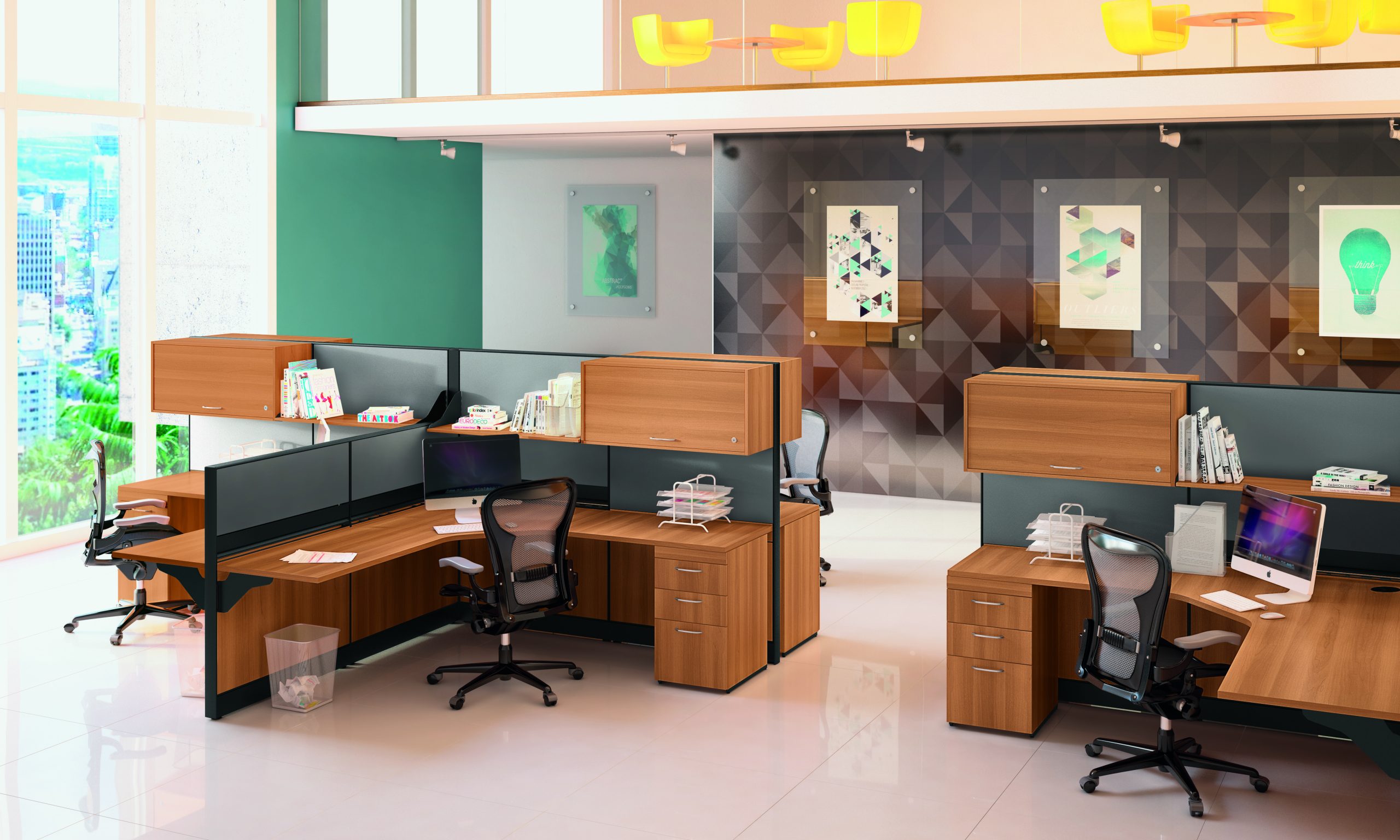 Conjunto de estação de trabalho, composto com placas de divisórias moduladas, na espessura de 50 mm, 70 mm ou 90 mm em melamínico acabamento filetado em todo contorno fixadas a estrutura atravez de click de saque frontal com opção de uso de armários suspenços montagem do ambiente de acordo com a sua necessidade.