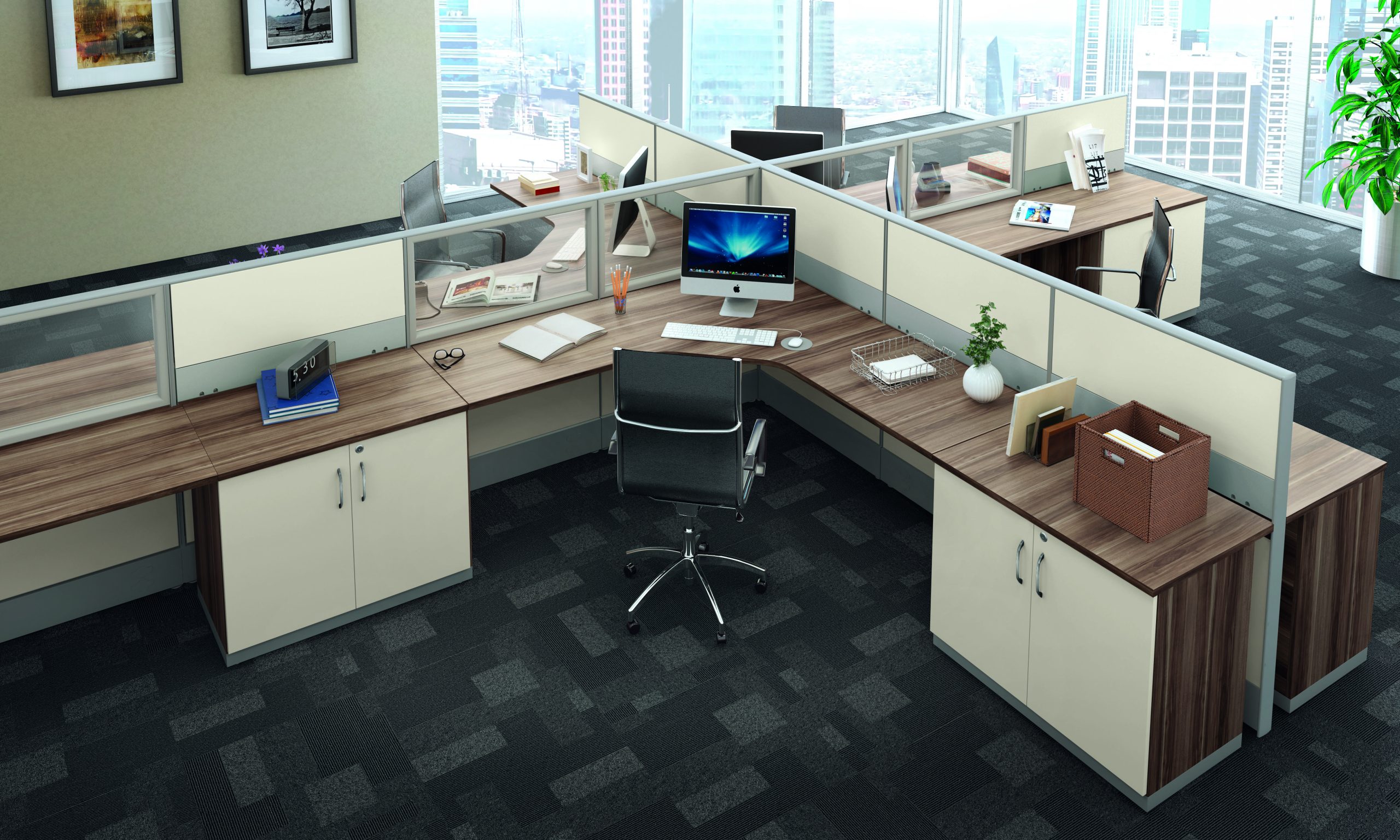 Conjunto de estação de trabalho, composto com placas de divisórias moduladas, na espessura de 50 mm, 70 mm ou 90 mm em melamínico acabamento filetado em todo contorno fixadas a estrutura atravéz de click de saque frontal com opção de uso de armários suspensos e gaveteiros de acordo com a sua necessidade.